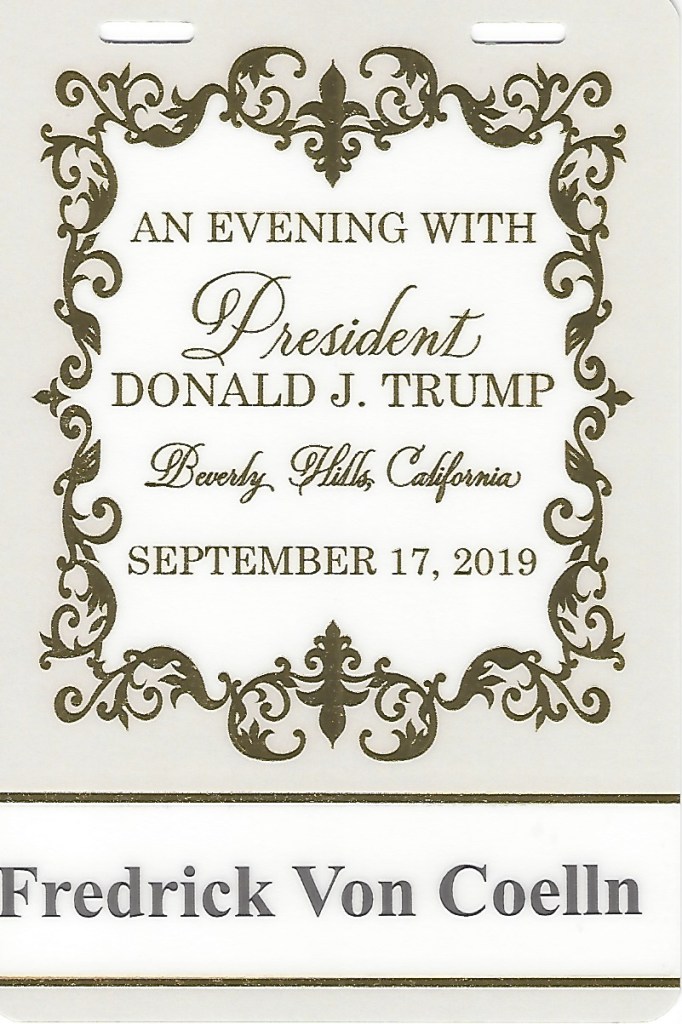We were attending “An Evening with President Donald J. Trump” at a home in Beverly Hills last September. A last- minute cancellation made way for us to join a local support group to sit at table number 35. We were 30 yards from our president and our cell phones were locked away so we couldn’t take a selfie nor could we record the speeches. Kimberly Guilfoyle and Donald Junior made excellent fact-filled campaign speeches prior to President Trump’s keynote speech. He was pumped after several campaign stops and he was entertaining in his unique style. I would love to have copies of all three speeches but no press was allowed and we, of course, were phoneless.