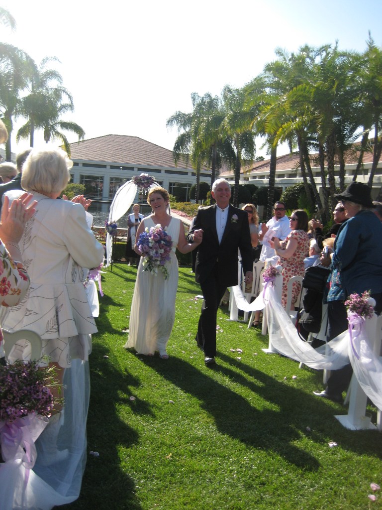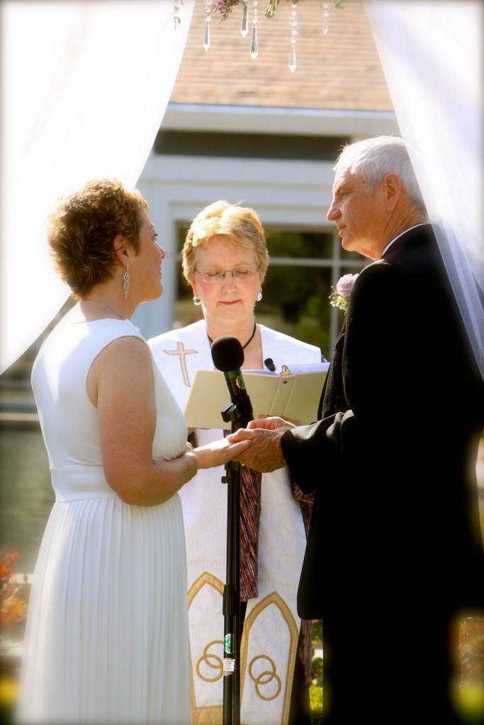 My pretty, wonderful, fantastic, awesome bride escorted by her son, Mark, walked down the aisle to Trumpet Voluntary in D Major (Purcell). I had already escorted Pastor Judi to the gazebo that served as our chancel (no music for us). I gave my ten-gallon hat to grandson (to be) Allen and waited in grand expectation.