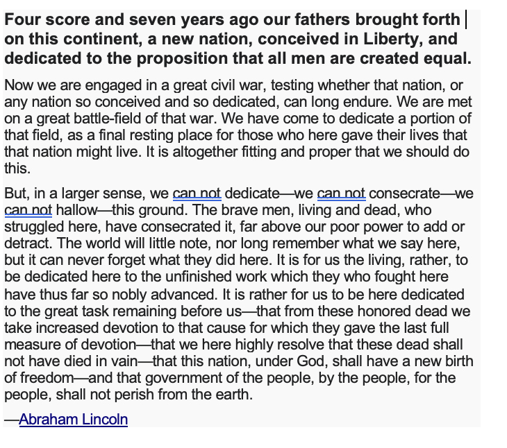 He goes on to quote the first two lines of President Lincoln’s Gettysburg address and emphasizes that our form of government, our constitution is an “experiment” and the importance of the words: conceived in liberty, where all men are create equal and that our nation can long endure.