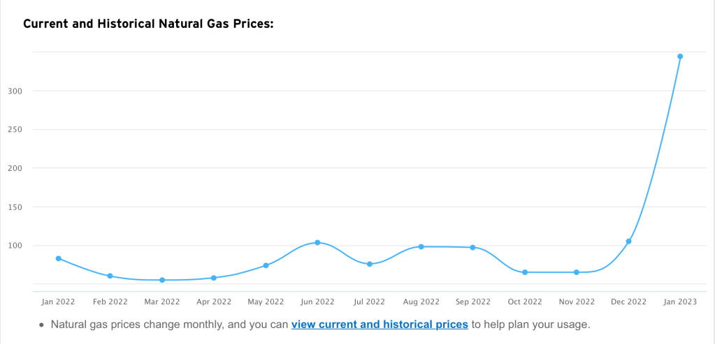 My bill last month was $66? My January bill is $246.27! Yes, my usage doubled in the cold winter months of December/January but the cost is nearly four times as much. OUCH!