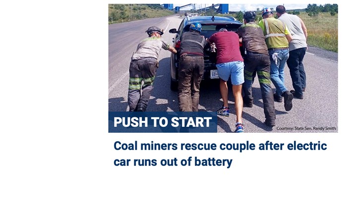 West Virginia: A group of West Virginia coal miners rescued a couple after their electric vehicle died, pushing the car to a charging station at the coal mine. West Virginia State Sen. Randy Smith (R) and coal miners Andrew Smith and Daniel … Continue reading You can’t make this stuff up.
