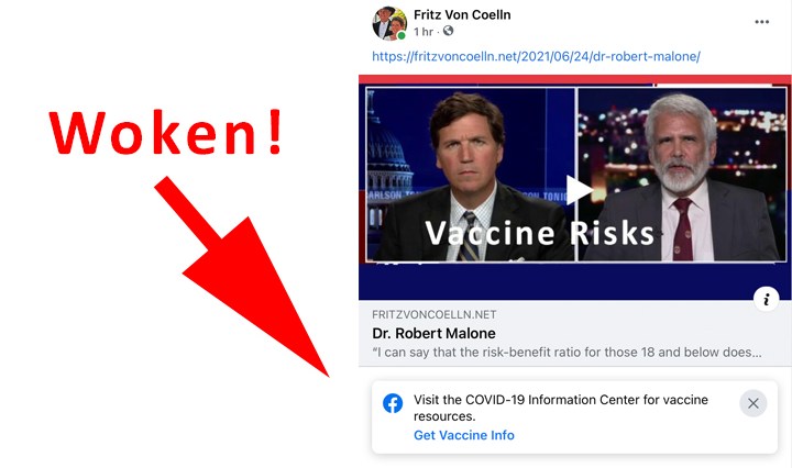Mention Dr. Robert Malone on Facebook and get woken! The good Dr. had his video discussion of vaccine issues canceled by YouTube. Facebook has skin in the game. True, it is only a notice to “Get Vaccine Info,” and that … Continue reading Scientific