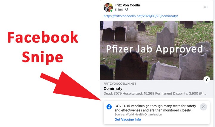 Facebook doesn’t like my attitude so it “snipes” my post. I said “Get your jab” in reference to Pfizer vaccine’s recent approval. However, I did list CDC/FDA statistics showing there is some downside, like dying after being jabbed. So I … Continue reading Check VAERS