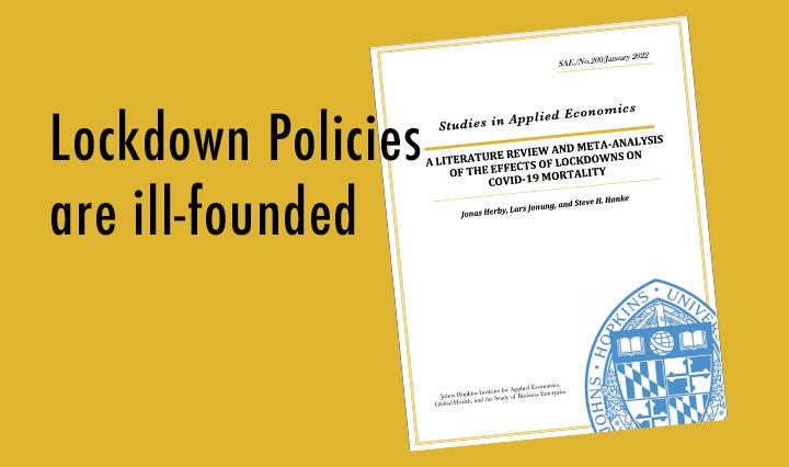 Lockdowns have had little to no effect on COVID-19 mortality Lockdown policies are ill-founded and should be rejected as a pandemic policy instrument. A LITERATURE REVIEW AND META-ANALYSIS OF THE EFFECTS OF LOCKDOWNS ON COVID-19 MORTALITY by The Johns Hopkins … Continue reading Darn, wish we knew that two years ago!